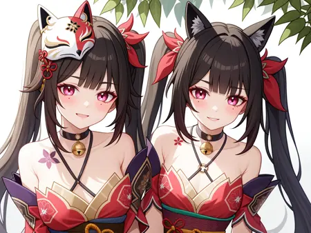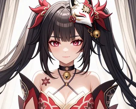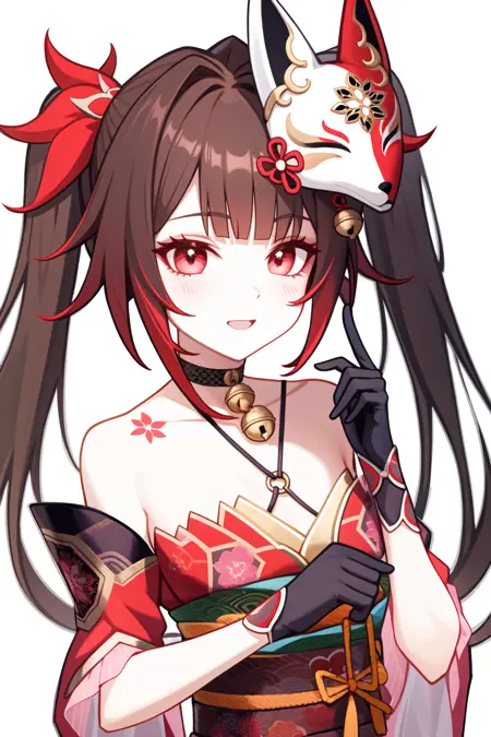 sparkle \\\(honkai: star rail\\\),1girl,solo,mask,twintails,fish,long hair,fox mask,smile,japanese clothes,bare shoulders,kimono,choker,bangs,cleavage,