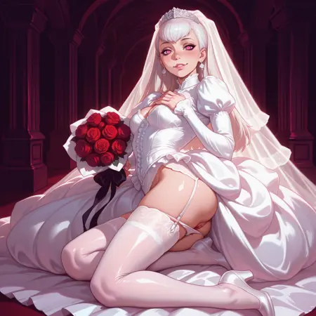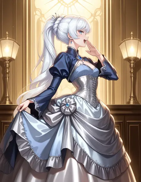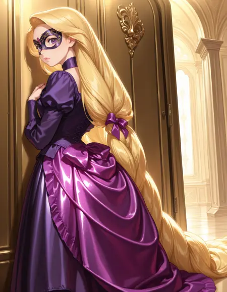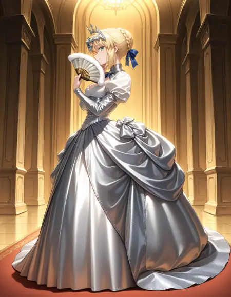 gown, ruched fabric, shiny satin, bustle skirt, frills, ribbons, bows
