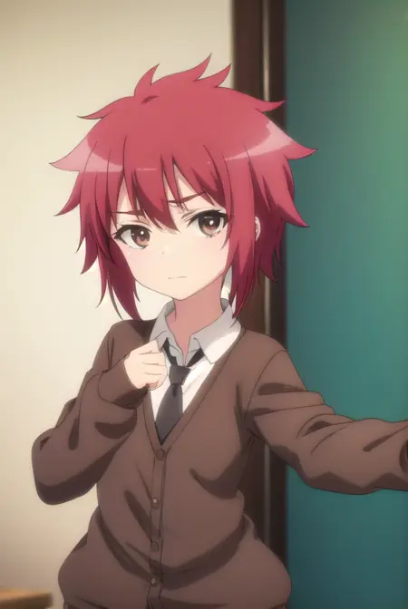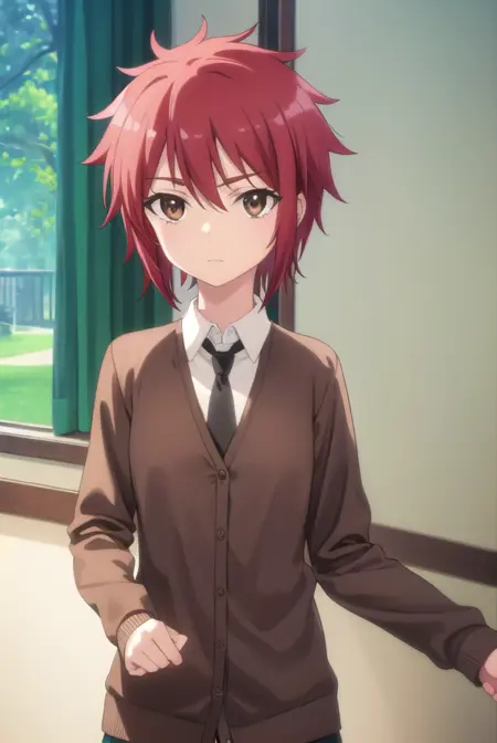 school uniform, necktie, shirt, white shirt, collared shirt, cardigan, brown cardigan,