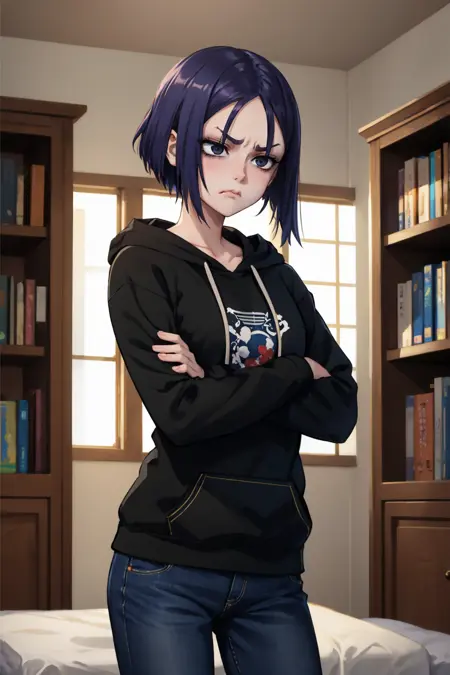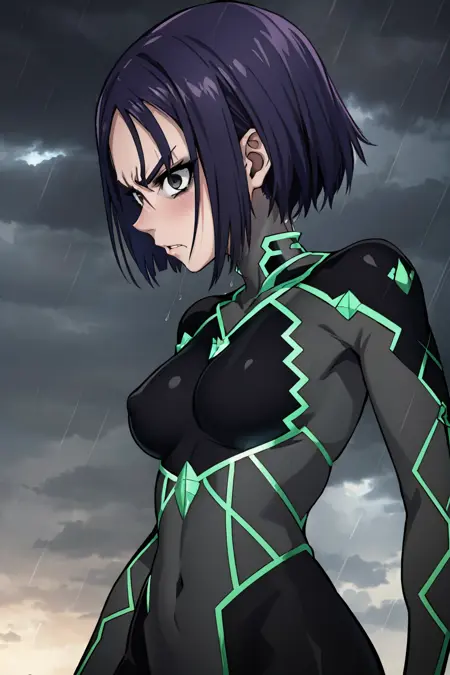 Add "black bodysuit, neon trim, glowing" for her typical look.