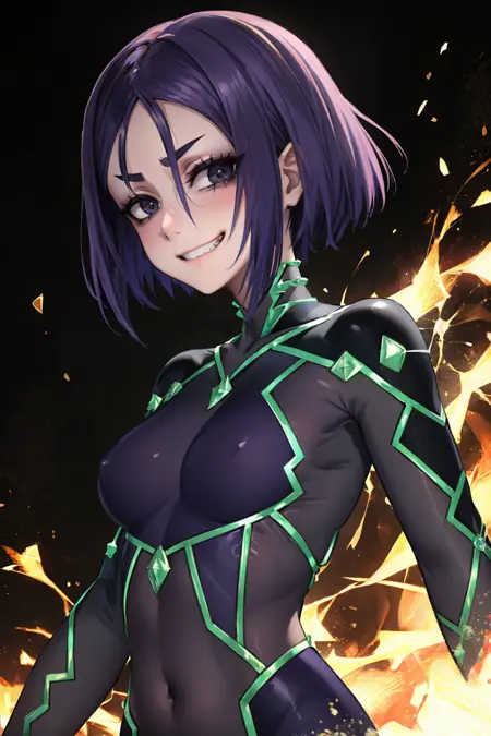 그녀의 전형적인 외모를 위해 "검은 바디수트, 네온 트림, 빛나는"을 추가하세요.