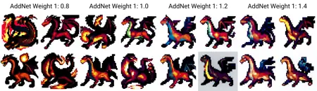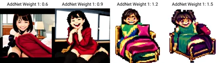 다소 복잡한 이미지의 경우, 가중치(0.6에서 1.5 사이)에 따라 "픽셀화된 상태"에서부터 "픽셀 인형 같은 상태"까지 다양한 효과를 낼 수 있습니다 (참고 이미지 참조).