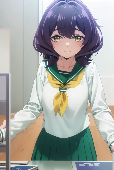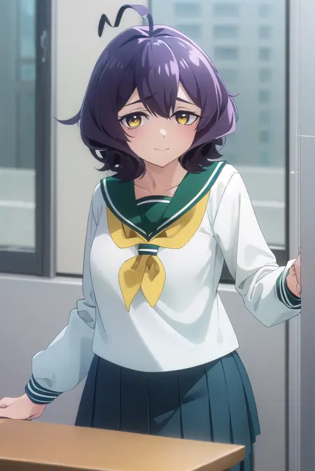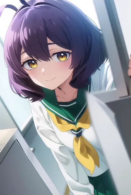 utena hiiragi, short hair, (yellow eyes:1.3), purple hair, ahoge, hair intakes,