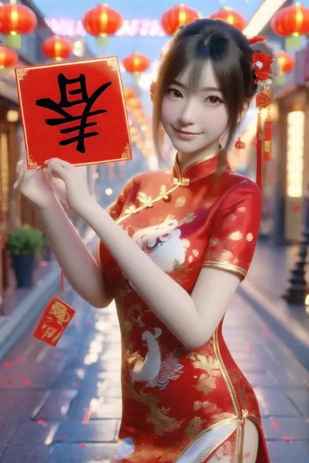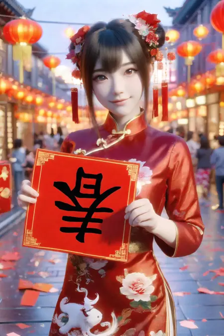 Example: Chinese word,1girl in a chinese dress holding a sign, 3d anime realistic, chinese new year in shanghai,