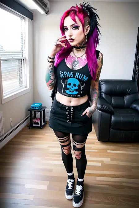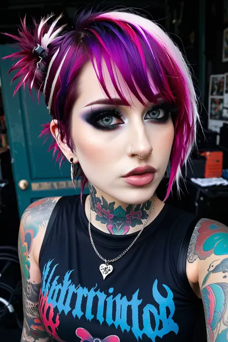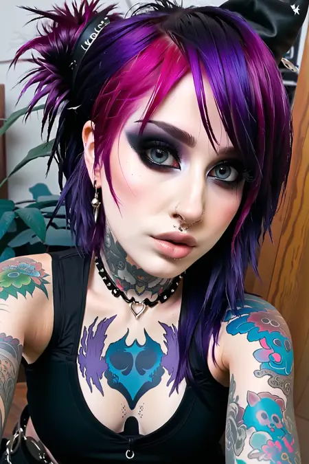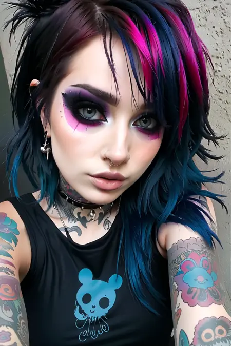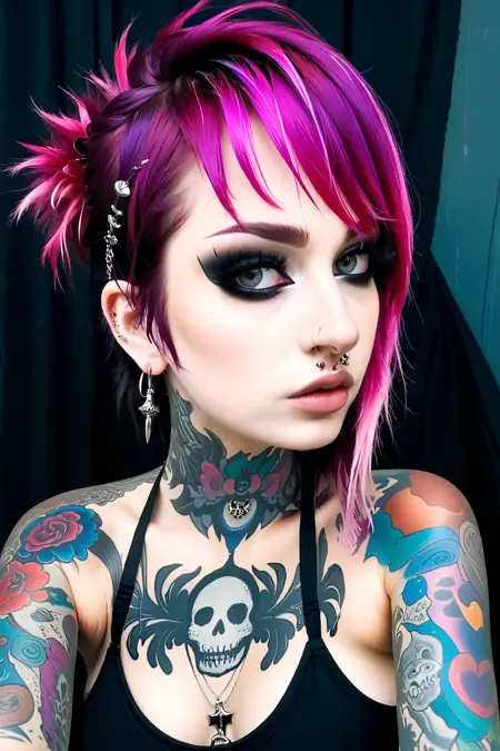 SDXL Version of Pink Emo LoRA. Trained on 200+ Images of beautiful alt women. For tattoos, piercings, punk, emo, goth, egirl.