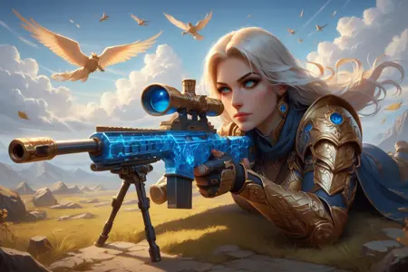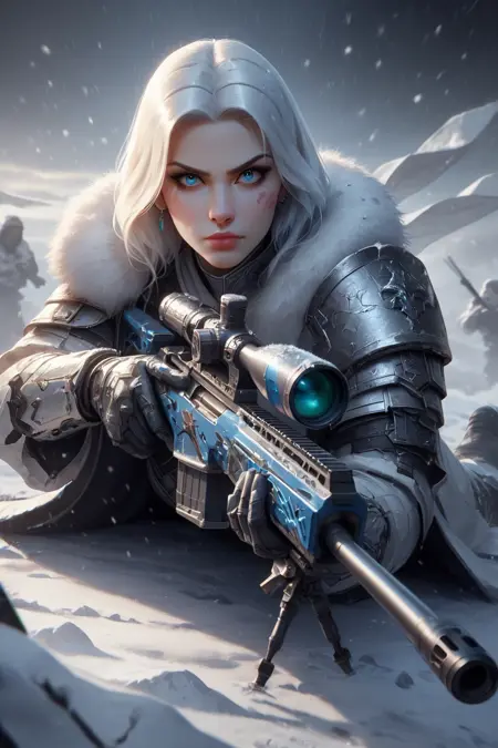 "score_9, score_8_up, score_7_up, upscale 2x, (a realistic action shot of a soldier wielding an (sniper rifle made of ice, pointing at the camera, wearing white armor, snowing, snow mountains in background:1.3):1.2)"