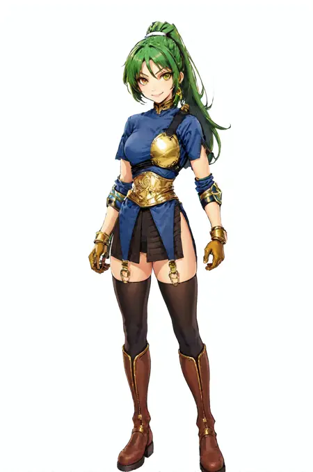 提示词:archerRo,蓝色衬衫,短手套,侧开衩裙子,金色盔甲,O型环,过膝袜,棕色靴子