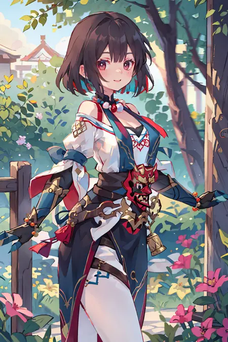 그녀의 기본 의상은 일반적인 태그로는 표현하기 너무 독특했습니다. 알려진 문제로는 드레스 아래의 검은 숏팬츠가 과도하게 나타나는 경우가 있습니다. 이 경우 검은 숏팬츠 태그를 삭제하면 골반 커튼이 정상적으로 생성됩니다. 그러나 일반적으로 V1은 대부분의 경우 올바른 의상을 생성하는 데 충분합니다. 권장 가중치는 0.7~0.9이며, 다른 의상에도 적용 가능합니다. 불필요한 의상이 나타나면 가중치를 낮추세요.