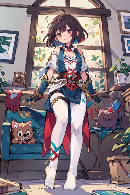 Additional prompts for her default costume: tabard, high heel boots, clawed gauntlets, bead necklace, white pantyhose, off-shoulder shirt, pelvic curtain, high belt, shawl, thigh strap, black shorts