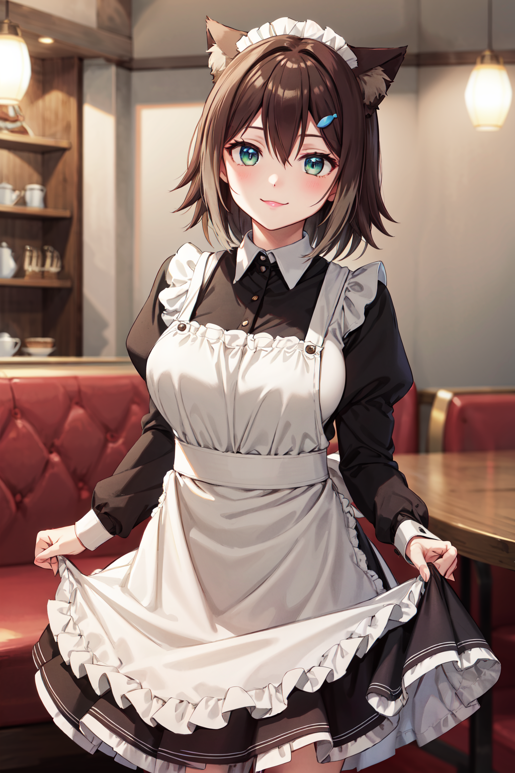 - bbtamaki、猫の耳、頭輪、長い髪、片側をアップ、眉間の髪、大きな胸、ネックレス、透け感、おへそ露出、取り外し可能な袖、猫の尾、骨盤カーテン、ハイレグ、スカート、黒いスカート、素足