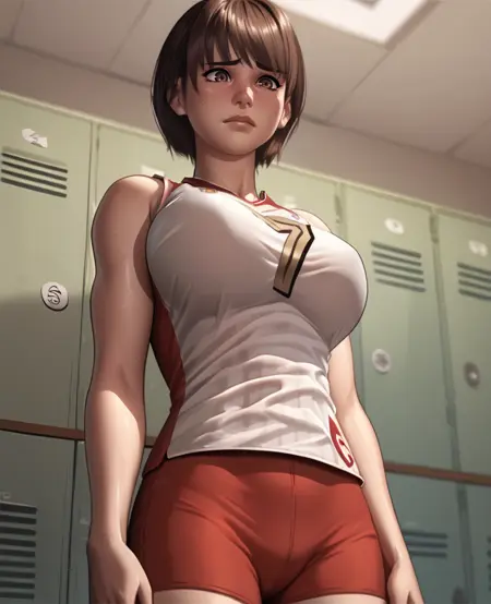 volleyball uniform, - red shorts, black socks, - sleeveless,