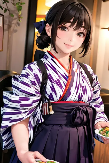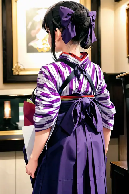 BMC, (yagasuri), japanese clothes, hakama, hakama skirt, kimono, boots, cross-laced footwear, lace-up boots, meiji schoolgirl uniform, tasuki, ribbon, hair ribbon, purple hakama,