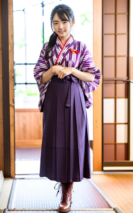 BMC, (yagasuri), japanese clothes, hakama, hakama skirt, kimono, boots, cross-laced footwear, lace-up boots, meiji schoolgirl uniform, tasuki, ribbon, hair ribbon, purple hakama,