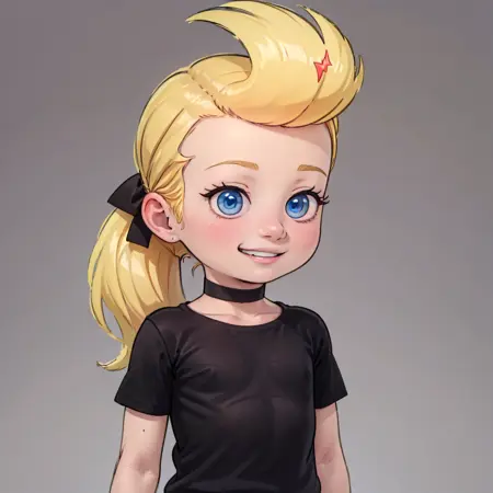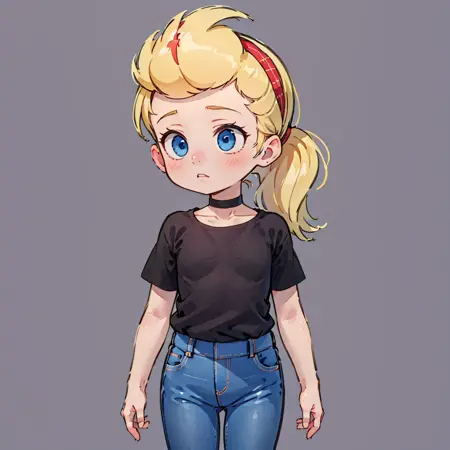 child, blue eyes, blonde hair, black choker, (low ponytail:1.2), hairband, black shirt, sissy Blakely, short sleeves, plaid skirt,