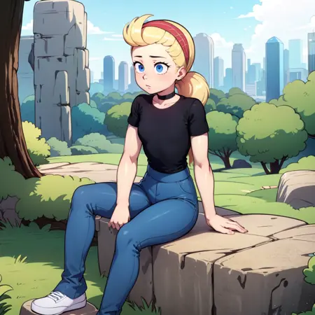 1girl, solo, sissy Blakely, blue eyes, blonde hair, ponytail, red hairband, black choker, black shirt, short sleeves, blue pants,