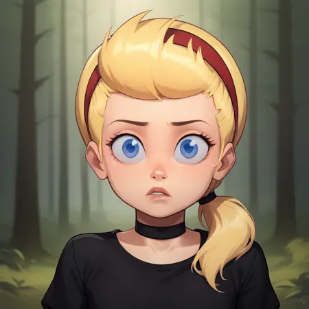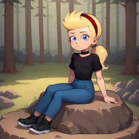 SissyBlakely, 1girl, solo, blue eyes, blonde hair, low ponytail, red hairband, black choker, black shirt, blue pants,