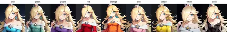 You can freely change her dress color by just putting the color you want before 'dress'. I tried to primarily keep her main attire faithful to the original, which means some of her alternate costumes which had a much smaller dataset to work with aren't 100% accurate.