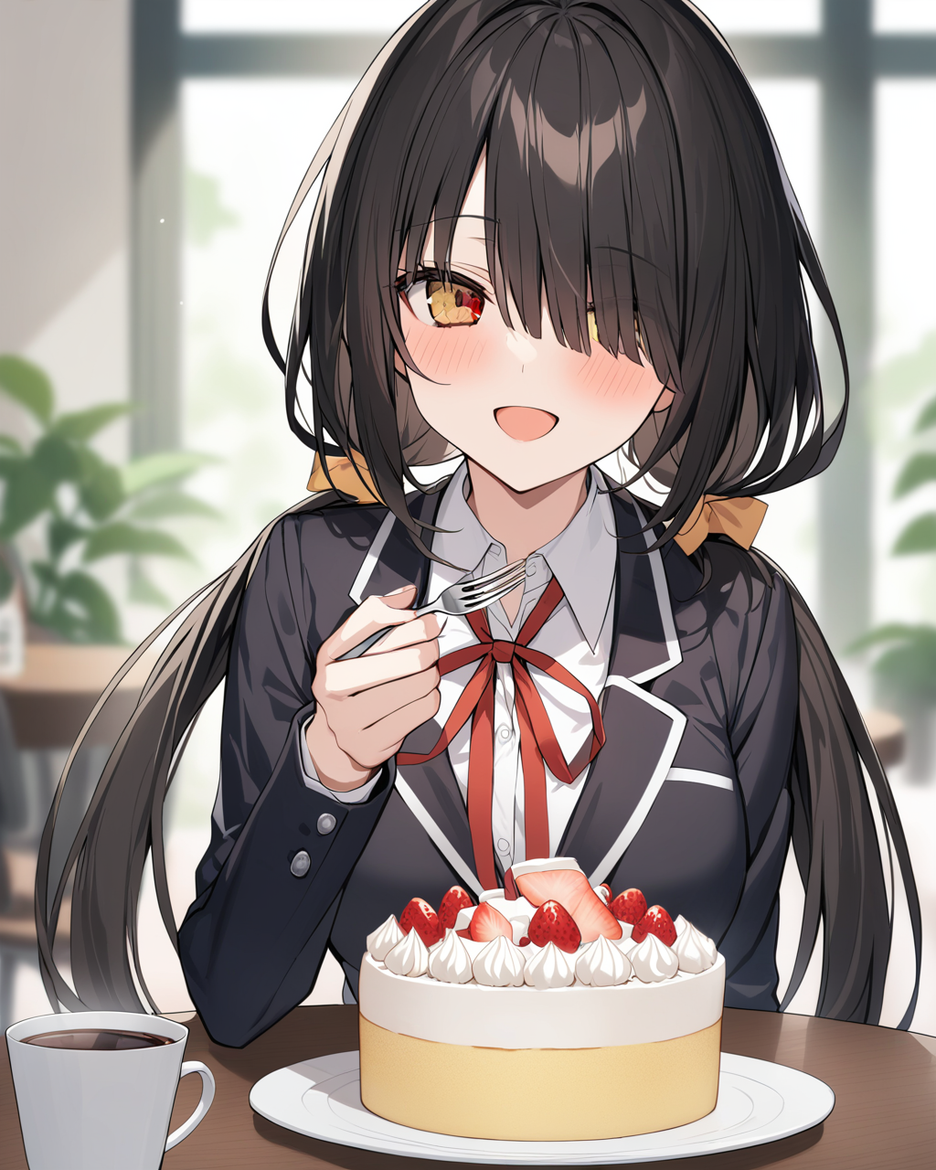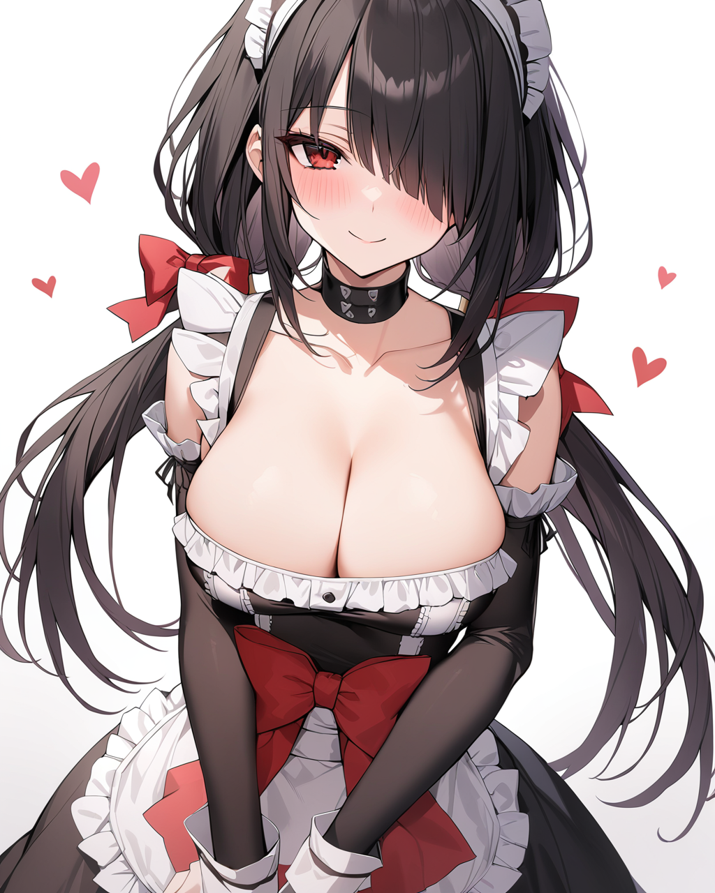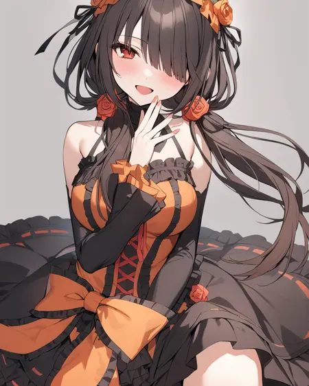 tag:1girl, tokisaki_kurumi, solo, twintails, breasts, clock_eyes, long_hair, black_hair, yellow_eyes, red_eyes, heterochromia, , cleavage, medium_breasts, hairband, lolita_fashion, lolita_hairband, symbol-shaped_pupils, floating_hair, collarbone, choker, ribbon, bare_shoulders, red_ribbon, dress