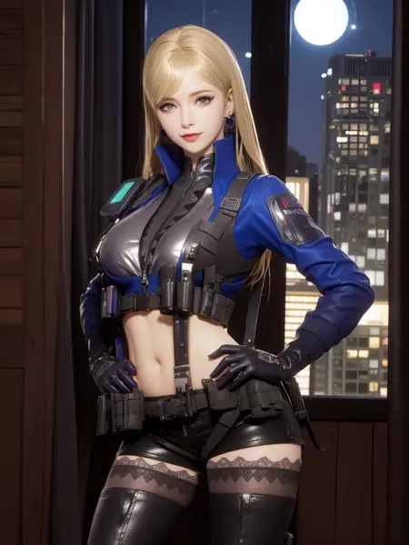 - CFlanxier, 1girl, solo,thighhighs, gloves, long hair, shorts, thigh boots, navel, blonde hair, blue eyes, earrings, looking at viewer, midriff, jewelry, breasts, crop top, cropped jacket, pouch, bangs, zipper, lips, long sleeves, belt,holster,cityscape, night, lace-trimmed legwear, (smile:0.8),