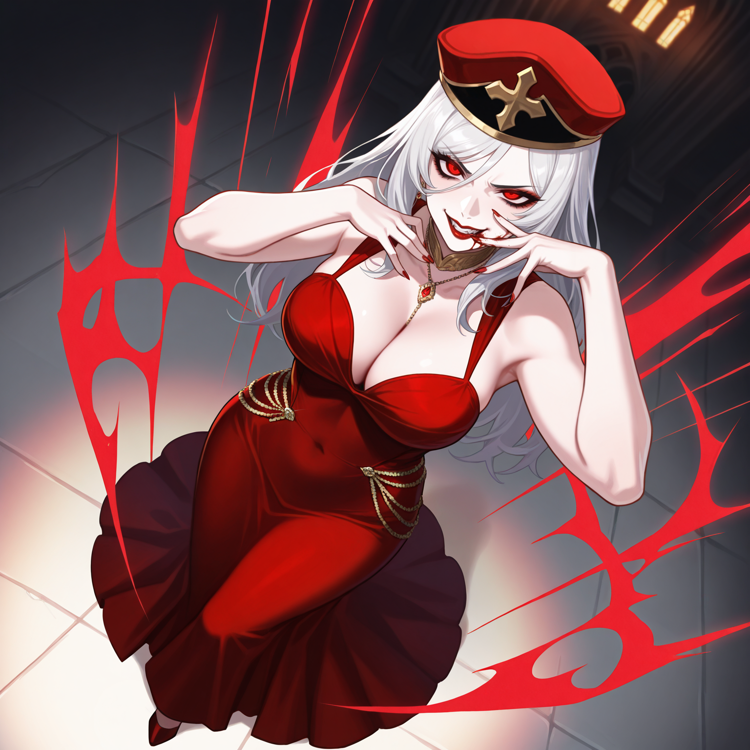 So invoke would be evening gown, (necklace), bare arms and add cleavage to taste.