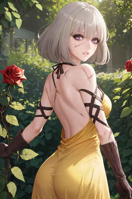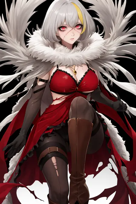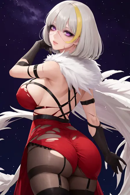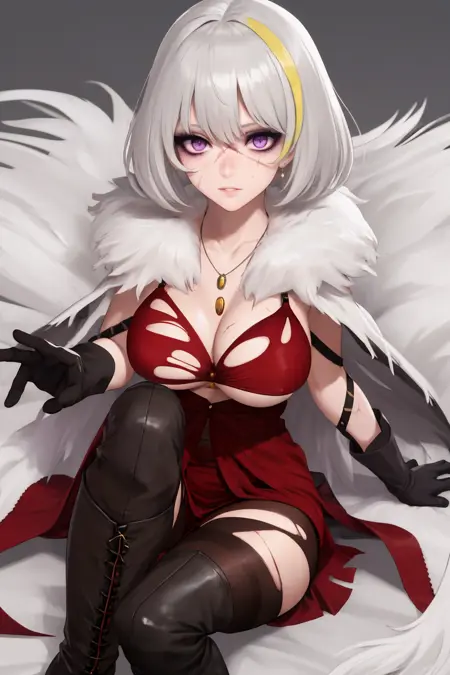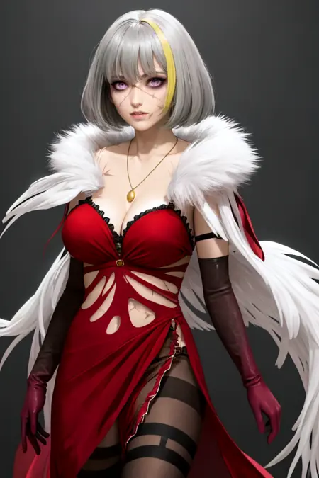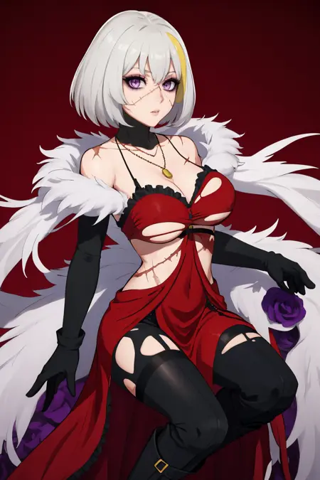 evaroux, purple eyes, eyeshadow, scar, scar on face, necklace, cleavage, red dress, torn clothes, underboob, black gloves