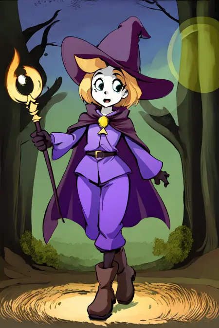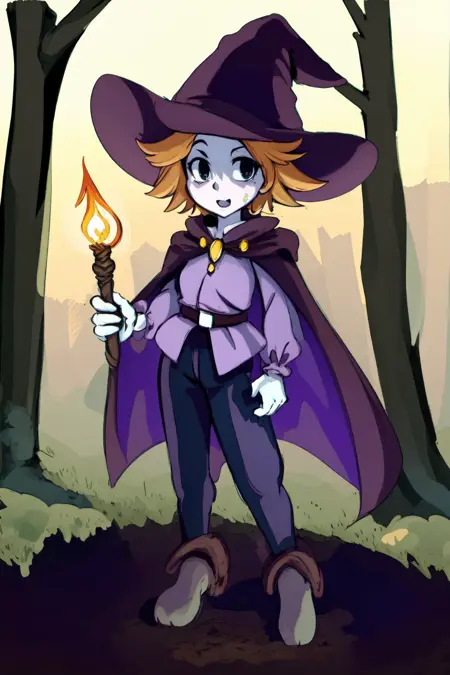 Witch Penny, one of the two main characters from the Cuphead knock-off Enchanted Portals. Prompt is "PennyEP", for her game outfit "witch hat,long sleeves,cape,gloves,pants,pantyhose,boots".