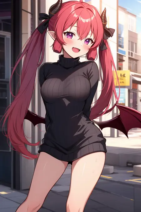 외모: 준코, 빨간 머리, 긴 머리, 눈 사이의 머리카락, 트윈테일, 보라색 눈, 뾰족한 귀, 악마 뿔, 악마 날개, 낮은 날개, 검은 리본, 머리 리본, 환상,