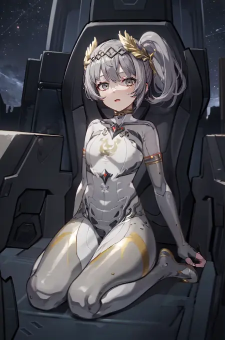 nanamistarfarer、グレーの髪、グレーの目、ショートポニーテール、サークレット、ホワイトのボディスーツ、ロボット関節