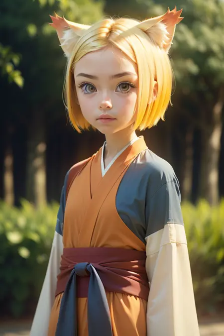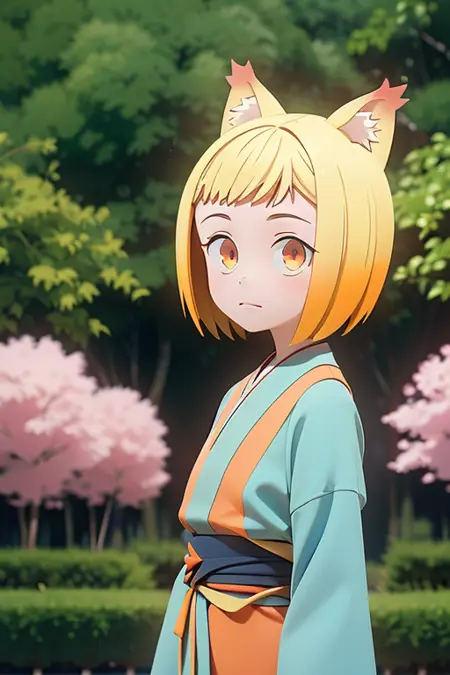 Use - Youukkoo, short hair, open mouth, blonde hair, orange eyes, fox ears, holding food, orange kimono and others tags in Lora info
