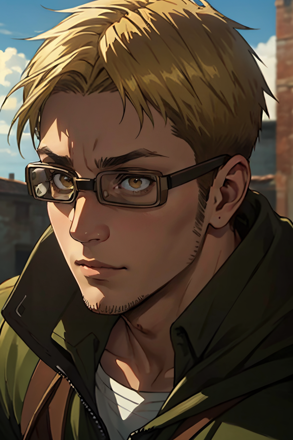 프롬프트: source_anime\(진격의 거인\), 아벨, ((금발 머리)), 단발, (긴 수염, 두꺼운 안면 수염, 수염, 턱선 스텁, 턱선 스텁), 파라디스 군복 \(진격의 거인\), (열려 있는 톤 컬러 단정한 재킷, 올리브 그린 언더셔츠), (안경 착용, 두꺼운 프레임의 안경, 머리에 띠가 감겨 있음, 고글 뒤의 눈), 흰색 바지, 검은 부츠, 녹색 망토\(진격의 거인\), 후드 망토, 3차원 기동 장비