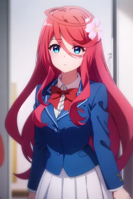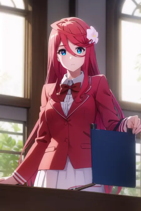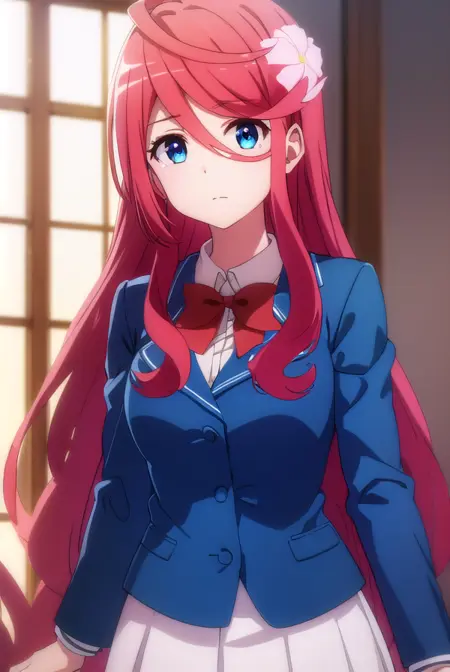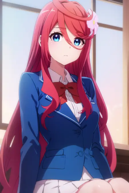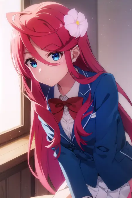 saria, long hair, blue eyes, hair ornament, hair between eyes, very long hair, flower, red hair, hair flower,