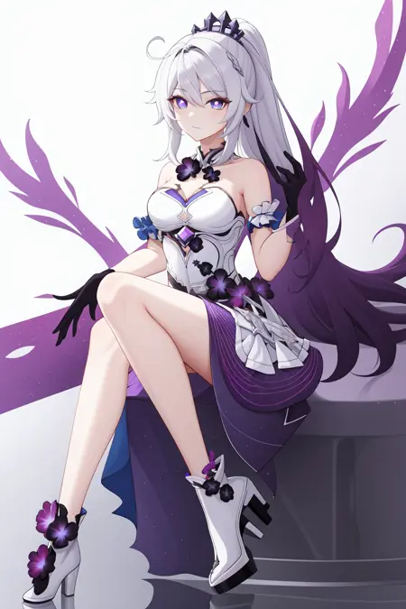kiana kaslana, kiana final, +_+,blue eyes,purple pupils,white gradient purple dress,purple wings,black hair ornament,silver crown,high heels,black flowers,white footwear,ponytail,