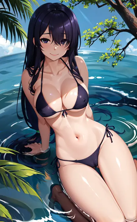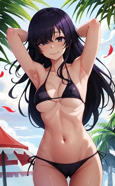 보라색 머리카락, 보라색 눈, 검은 눈, 매우 긴 머리카락, 긴 머리카락, 한 눈을 가린 머리카락, 큰 가슴, 거대한 가슴;