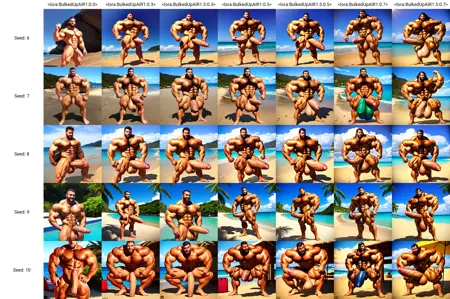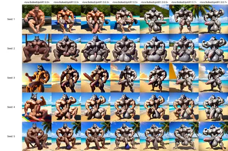 코히야의 GUI를 사용해 제작된 BulkedUp AI LoRA입니다. 이 LoRA의 목적은 다양한 스테이블 디퓨전 모델에서 더 큰 근육질 남성을 생성하는 것입니다. 저는 개인적으로 이 LoRA를 0.3에서 0.5 강도로 사용하며, 0.3 강도는 살짝 근육을 강조하고 0.5는 더욱 커지고 무성한 효과를 줍니다. 이 LoRA는 다양한 모델에서 작동할 수 있지만, 일반적인 모델과 털털한( furry ) 모델을 병합한 경우에 특히 효과적입니다. 제가 추천하고 싶은 모델 병합 예시는 Gay621 Solo Male Focus와 Homoerotic v2.0의 결합이며, 가중 합 곱(Multiplier)은 0.3 또는 0.5를 추천합니다.