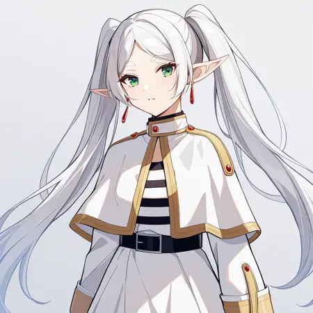 1girl,solo,pointy_ears,twintails,green_eyes,long_hair,jewelry,white_hair,white capelet,earrings,elf,capelet,belt,shirt,dress,parted_bangs,long_sleeves,bangs,white_dress。