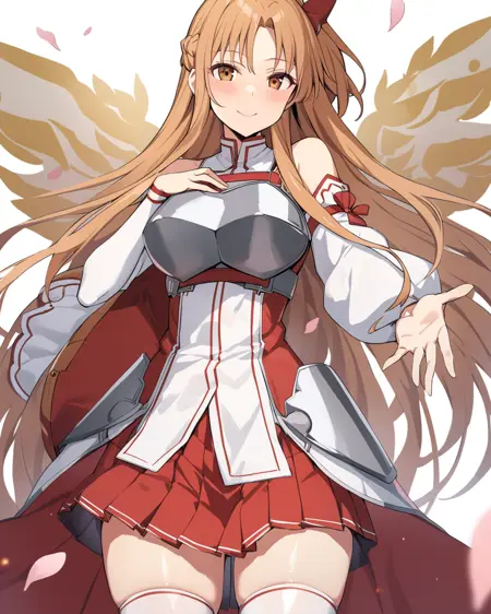 tag:asuna_\(sao\), long_hair, skirt, red_skirt, detached_sleeves, windmill, white_thighhighs, brown_hair, brown_eyes, breastplate, solo, pleated_skirt, miniskirt,white_belt