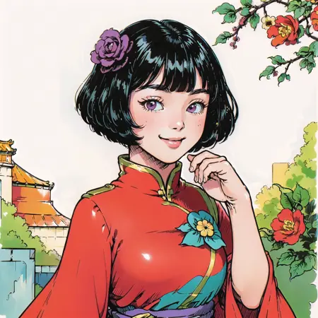 黒髪、ボブカット、前髪はストレート、髪に花、中国風のドレス、紫色のドレス、ズボン、長袖、