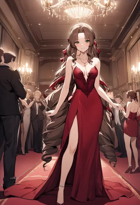Add "altaerith, very long hair, hair ribbons, drill hair, red ribbons, star necklace, red ballgown, bare shoulders, strapless, plunging neckline" for her red dress.