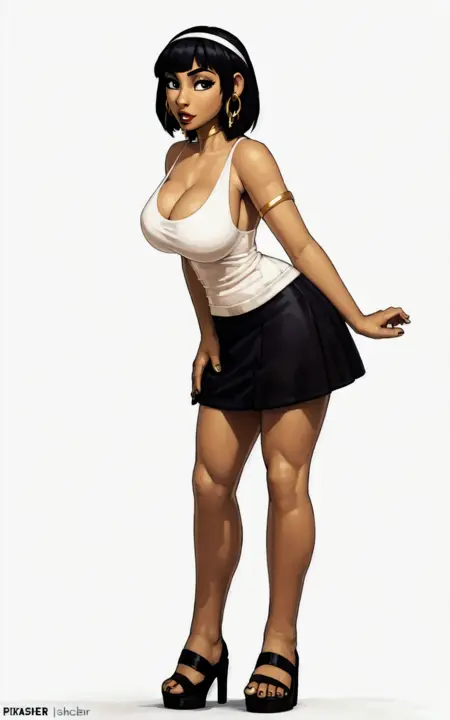 For her Outfit: platform footwear, sandals, black sandals, skirt, miniskirt, black skirt, tank top, white tank top, cleavage, armlet, jewelry, hoop earrings, hairband**