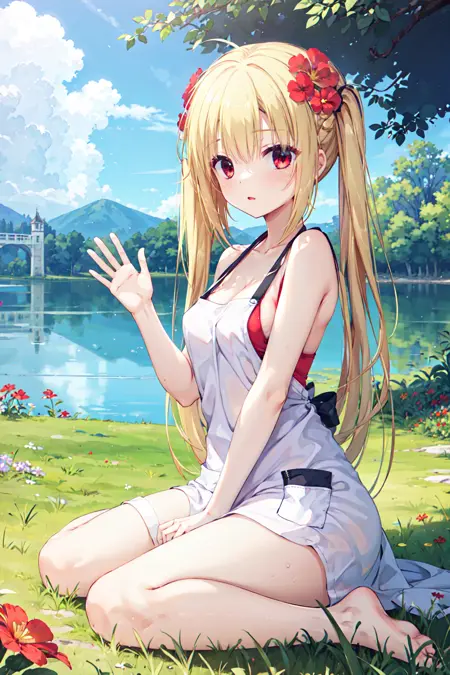 nanami,nanami apron, blonde hair, red eyes, 1girl,long hair, twintails, hair