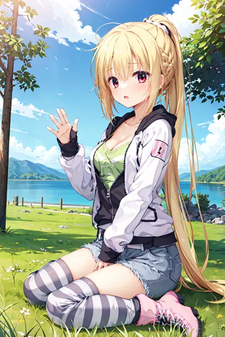 arihara nanami,nanami home, blonde hair, red eyes, 1girl,long hair,grey shorts,multicolored jacket, open jacket,striped thighhighs, green shirt, pink boots,open jacket, collarbone,ponytail, sleeves past wrists, cleavage, white hair ornament, white belt,black jacket,white jacket