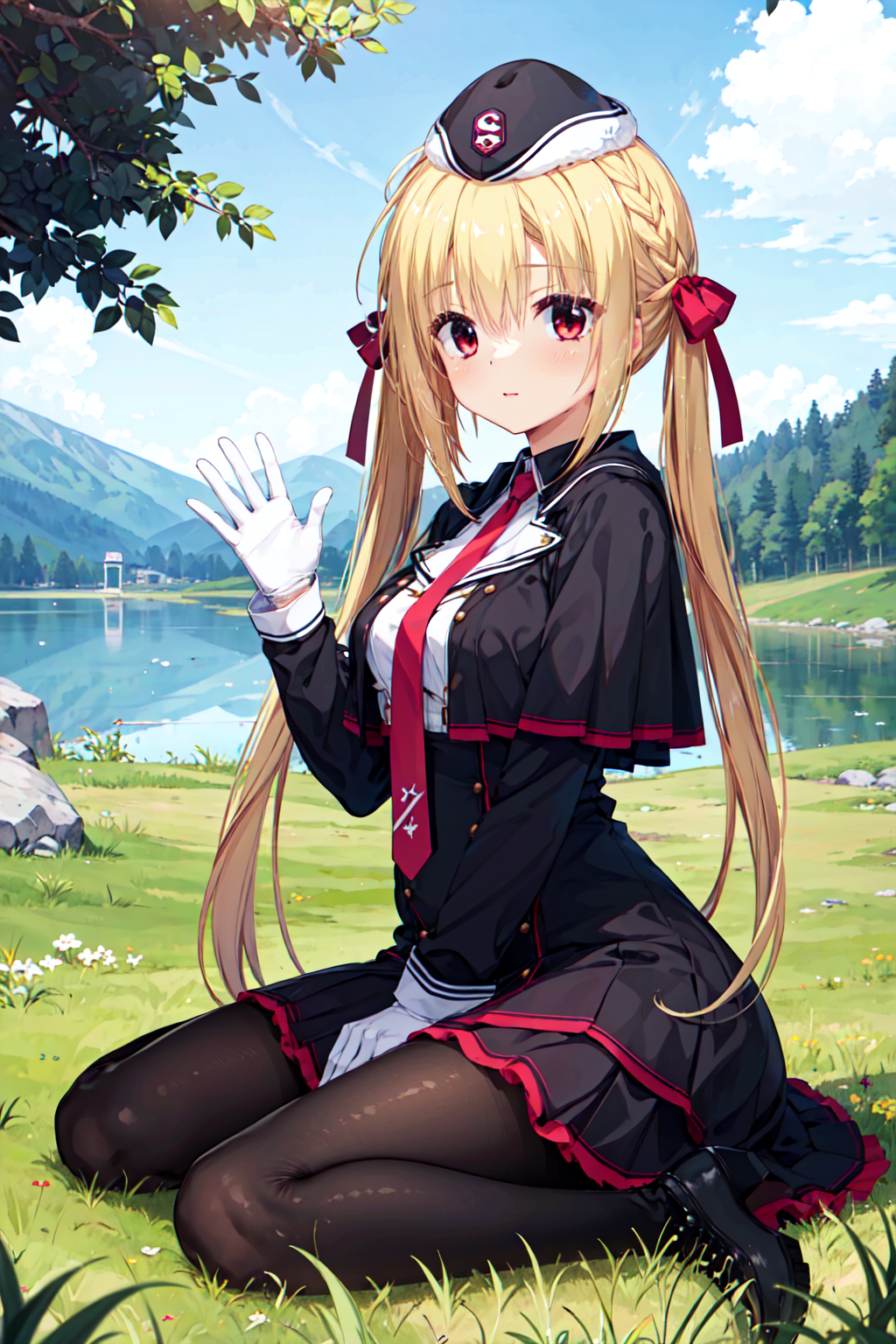 pantyhose,white gloves,black hat, twintails, red necktie,red hair ribbon,black