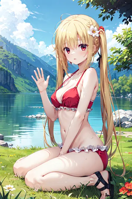 bikini,frilled bikini,sandals,red hair flower, hair ornament,