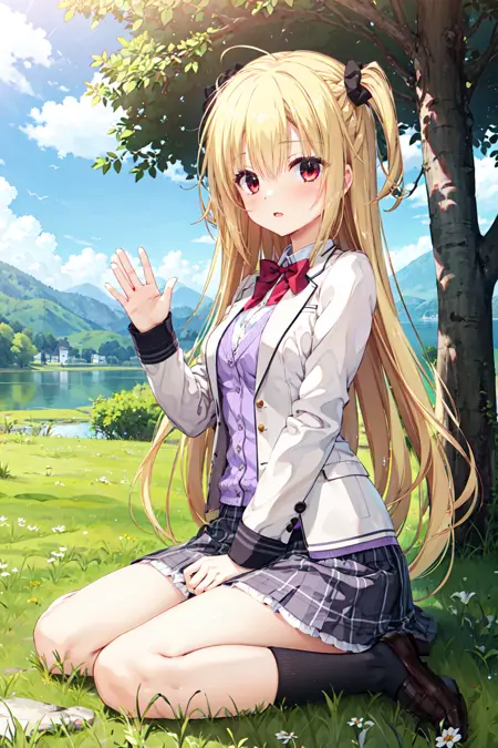 arihara nanami,nanami school, blonde hair, red eyes, 1girl,long hair, bangs,sleeves past wrists,black shoes, grey socks, pleated skirt, blonde jacket, open jacket,purple cardigan,white shirt,red bowtie, red bow,two side up,