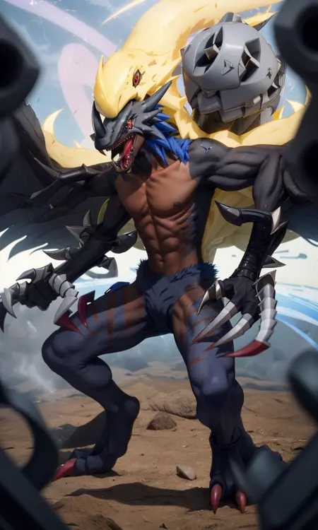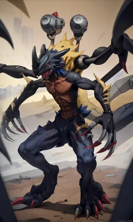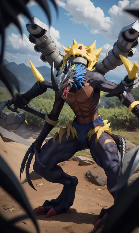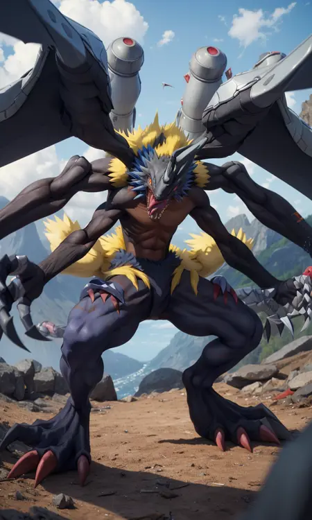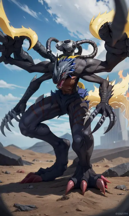 가장 효과적인 프롬프트는 다음과 같습니다; Millenniummon2024, Digimon, 4 arms, claws, two shoulder cannons, yellow phoenix,1 horn