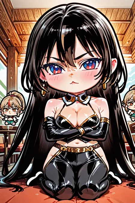 Trigger : a woman, long hair, golden eyes, collar, corset, gloves, cut out pants