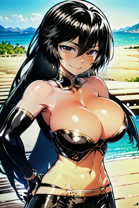 Trigger : a woman, long hair, golden eyes, collar, corset, gloves, cut out pants