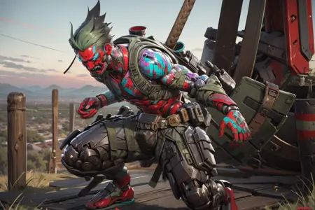 recommanded:1boy,solo,cyborg,sandals,fangs,ninjamecha,mechanical arms,2d,glowing,glowing eyes,no human being,(thick limbs:1.3),mask,muscular,weapon on back,