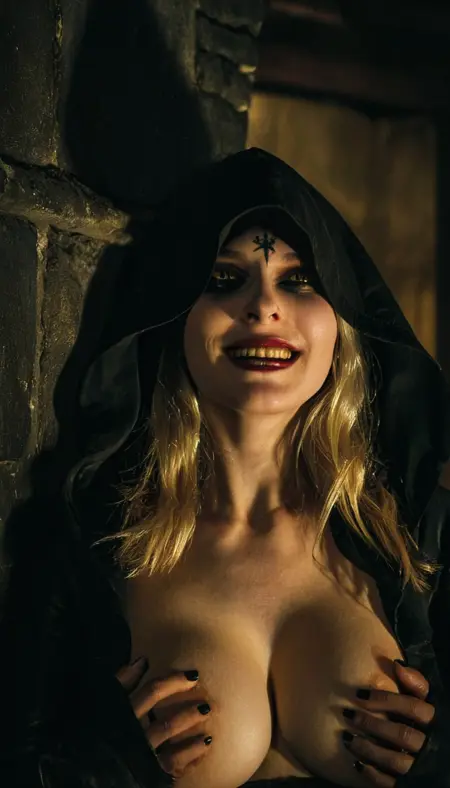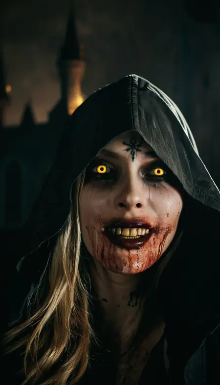 프롬프트에 피, 노란 눈, 후드 착용, 창백한, 회색 피부를 추가하는 것을 고려해보세요. 노란 눈은 일부 모델에서 치아도 노랗게 만드는 경향이 있으므로, 이를 방지하려면 노란 치아를 네거티브에, 하얀 치아를 포지티브에 추가하세요.