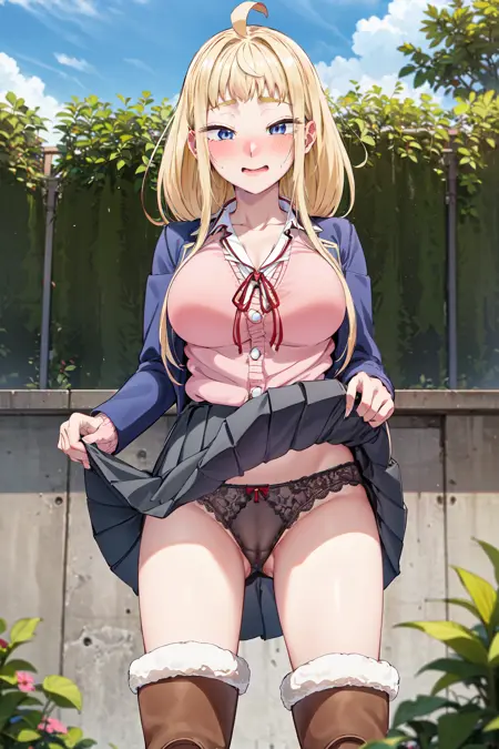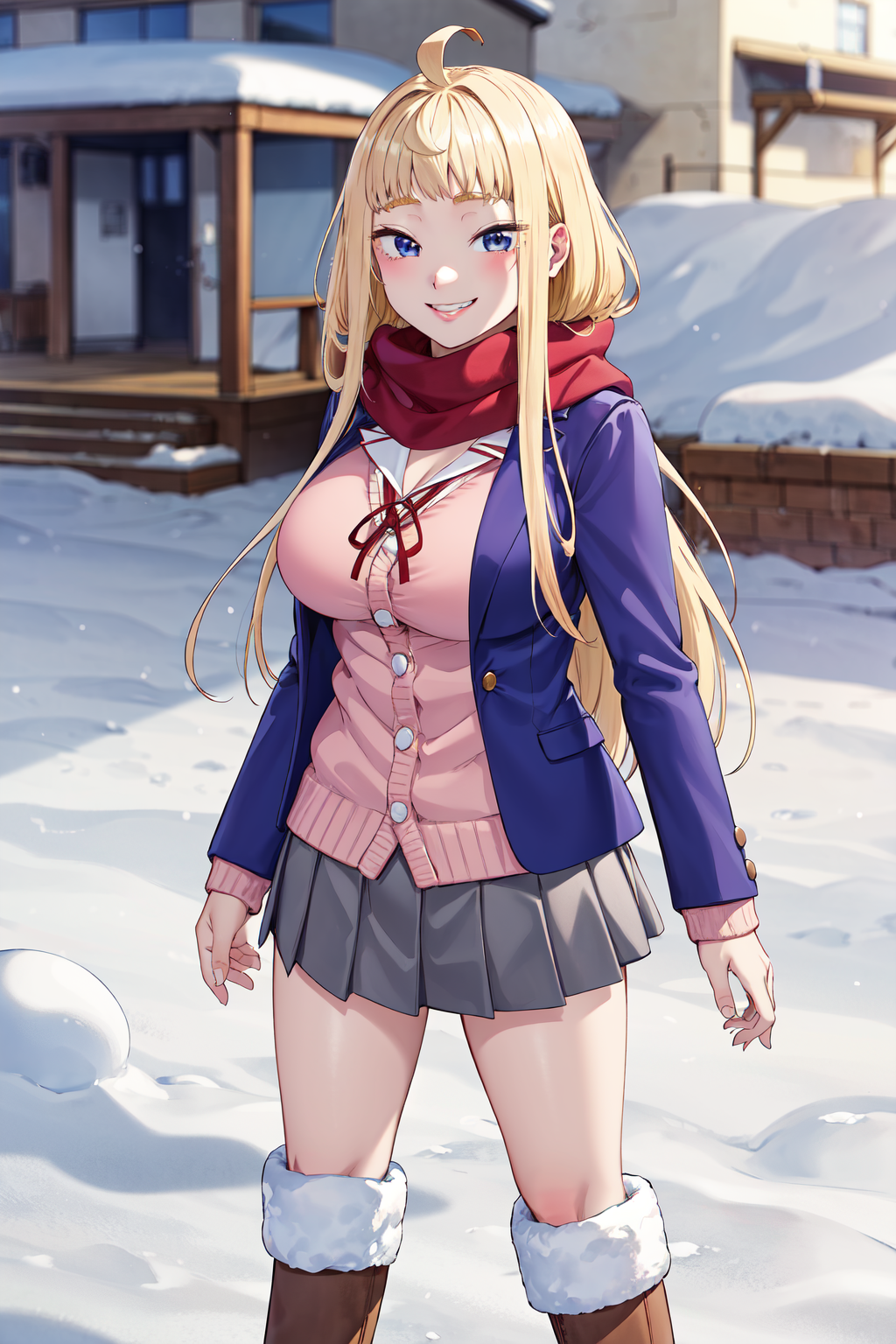 • aaminami,long hair,ahoge,large breasts,school uniform,scarf,red scarf,blue jacket,open clothes,long sleeves,neck ribbon,pink cardigan,shirt,grey skirt,boots,fur-trimmed boots,brown footwear